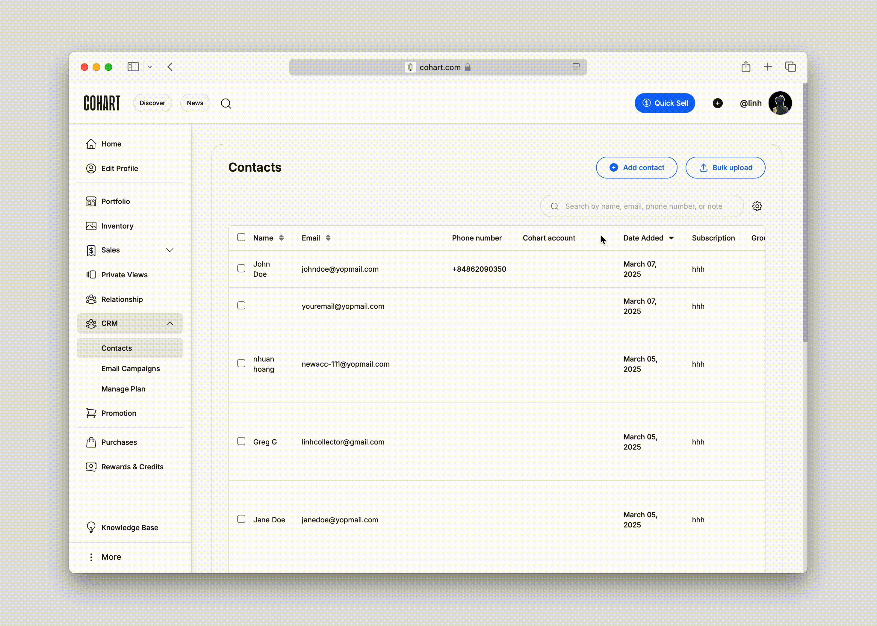 Cohart's Contacts list allows artists to view, track, and manage their contacts and subscribers—on and off the platform.